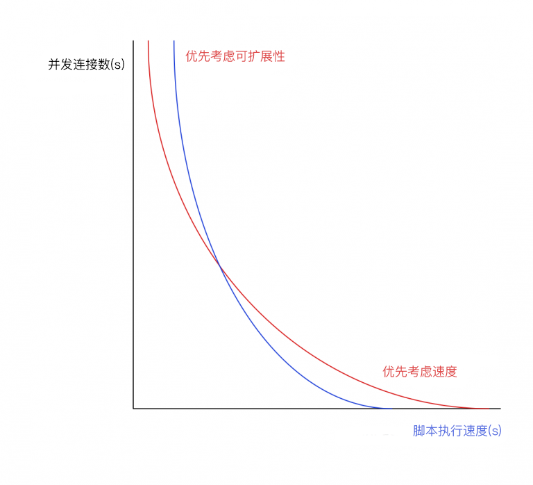 红线表示针对速度进行了优化的脚本,蓝线是可扩展性优先的脚本。当并发连接数低时,红线运行速度更快; 然而,随着并发连接数量的增加,红线变慢。当并发连接数上升时,蓝线也减慢;然而,下降并不那么剧烈,因此,在一定阈值后,速度优先的脚本会比可扩展性优先的脚本慢。然而,在现实当中,一些脚本可能随着运行环境的变化而表现出前后不同的性能差异。你需要仔细的观察用户的使用情况,以及应用的并发请求数量,来适时调整合适的优化策略。